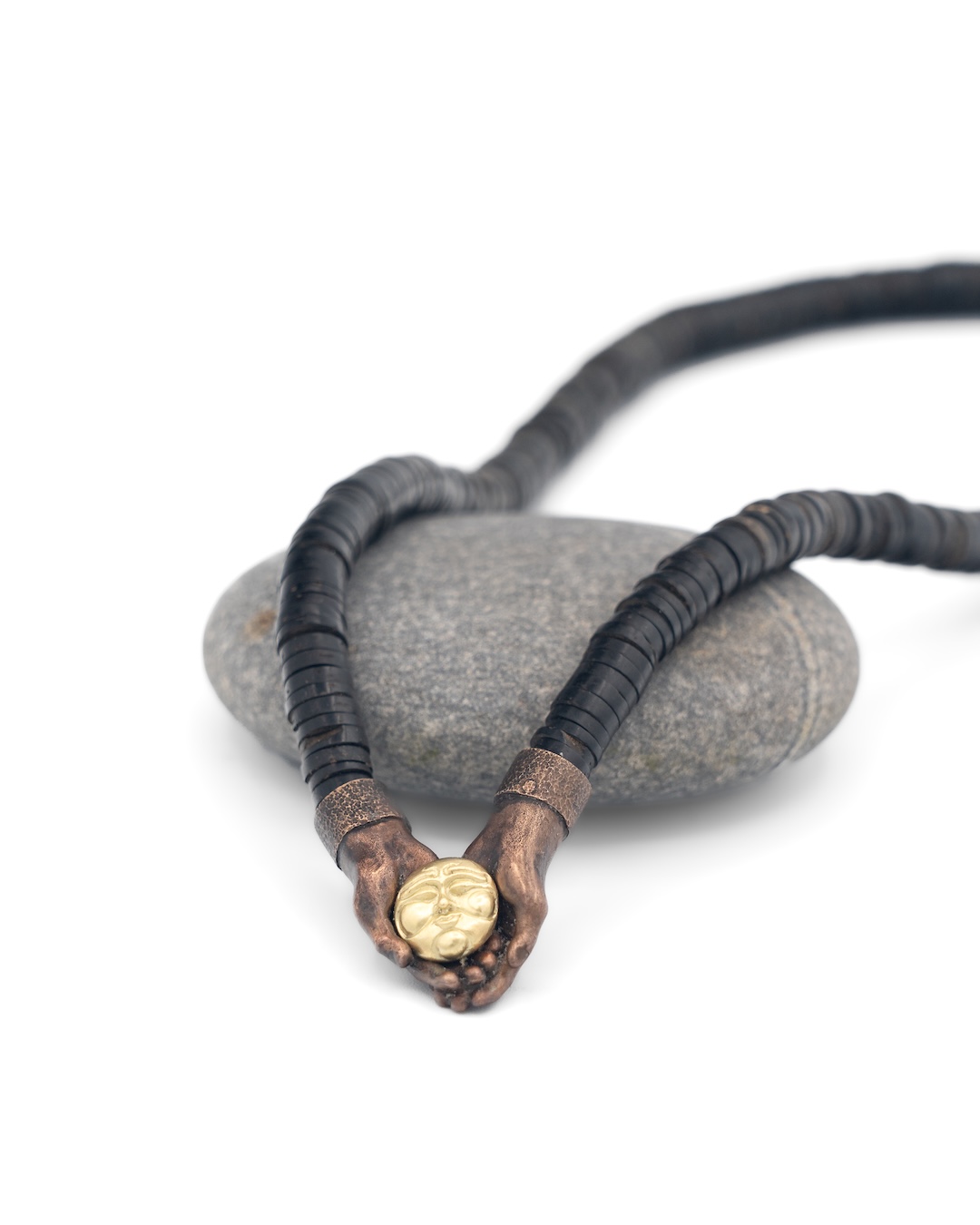 On view is “Revelation,” from his series The Offering, crafted in 18k gold and bronze with antique coconut heishi beads.